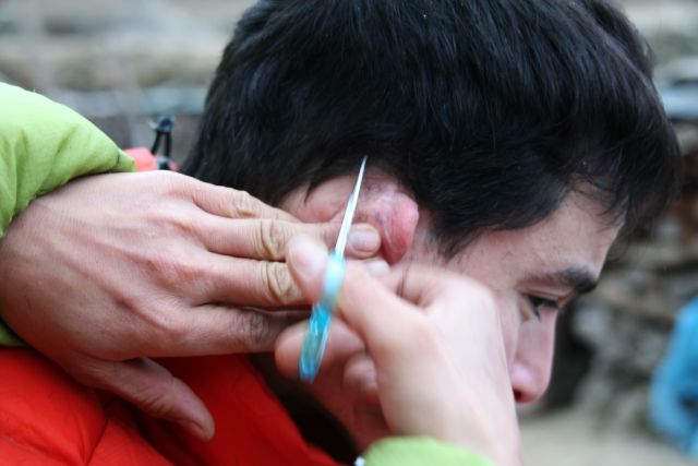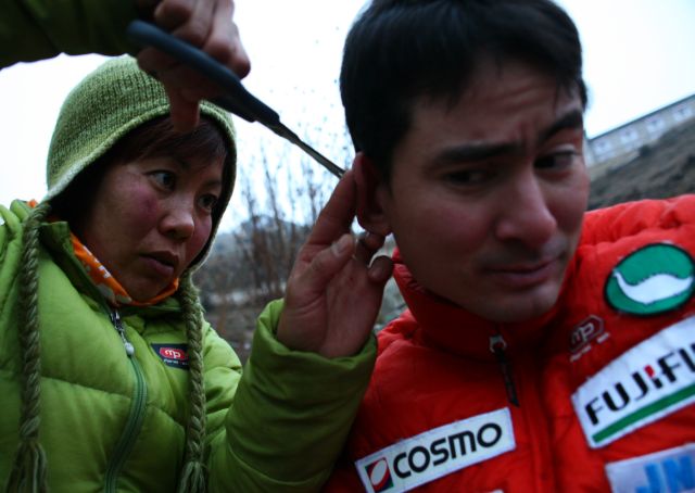 カトマンズで床屋に行く予定であったが、バタバタしていて結局髪の毛を切れないまま清掃トレッキングが始まった。しかし、耳周りなど、髪の毛が長いのが気になり、気持ち悪くて仕方がない。ナムチェバザール村に床屋がないものかと探してみたら2件あったが、床屋の主が冬は寒いとカトマンズに下っており閉店。「ちゃんと働けよ!」とブツブツと愚痴りながら宿に戻ったら谷口けいさんが「健さん、私が切ってあげる!マナスルではドクターケイとして小西さんの歯を治したのだから髪の毛ぐらい切れるよ」と自信満々。「けいさん、歯と髪の毛とではちょっと違うと思いますが・・・」と謙虚に意見させて頂いたら「そんなことないよ。男でしょ!ジタバタしないの!ハイ、今から散髪始めるよ!」といつの間にか手に大きなはさみとくしを持っていた。ドクターけいがバーバーけいに変身し、散髪がスタート。