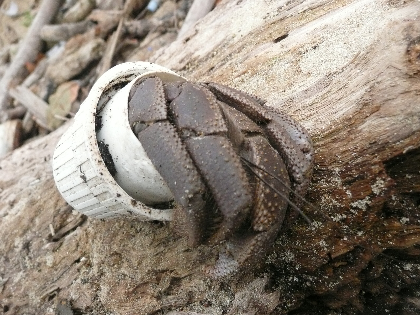 プラスチックのふたを宿にしている天然記念物のヤドカリ