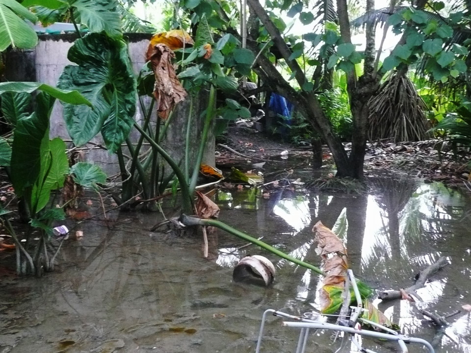 毎年この時期になるとツバルの人々を悩ますのが、大潮による塩害だ。この日も午後4時半過ぎから至る所で地面から水が湧き出す。舐めてみると塩味。海水であることが分かる。ツバルはサンゴ礁の上に砂が堆積してできた島だ。つまり地下のサンゴがまるでスポンジのような役割を果たし海水を浸み込ませそして吸い上げ地面から噴き出すのだ。そしてその海水がツバルの主食であったタロイモやバナナ畑などに流れ塩害の被害を引き起こす。また、数十年前まで地下水をくみ上げて生活していた井戸も塩水が交じってしまい首都フナフティでは全滅。飲み水は雨水を溜めるか、海水を淡水化する装置で淡水にするかしかない。したがっていつでも水不足であり特に乾季となるとなおさらだ。水も食べ物もない所では多くの食糧を海外に依存しなければ人々は生きていけない。したがって首都フナフティの食料自給率は4割前後と極めて低い。