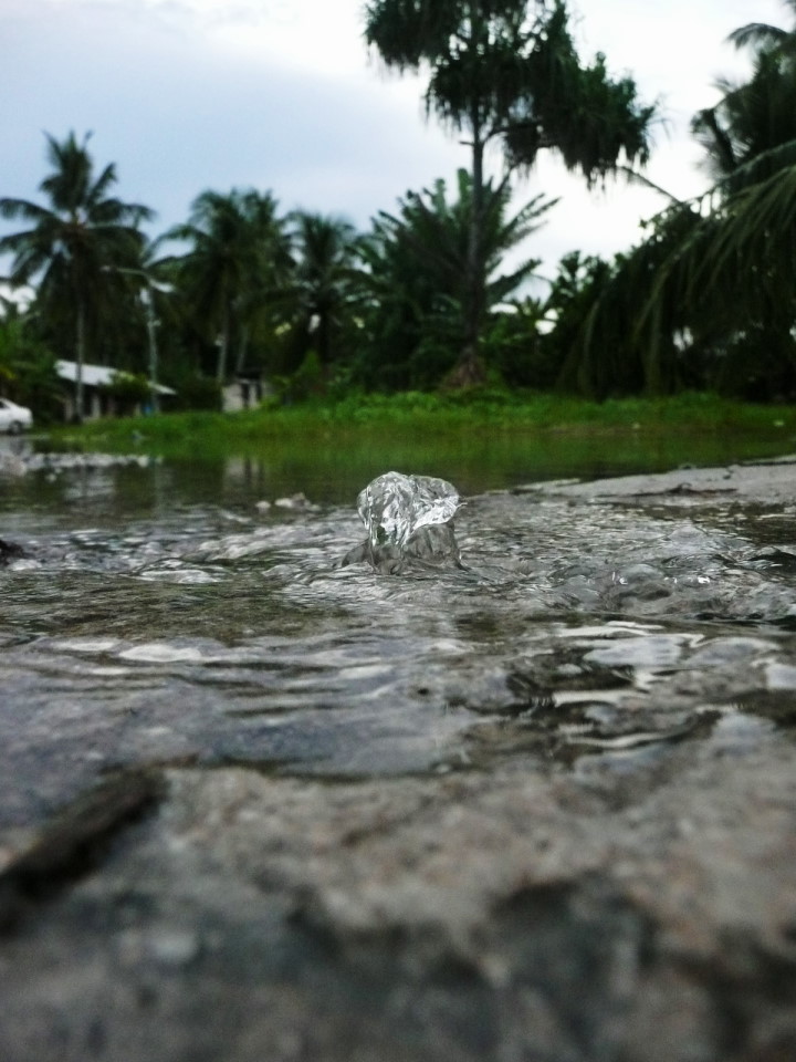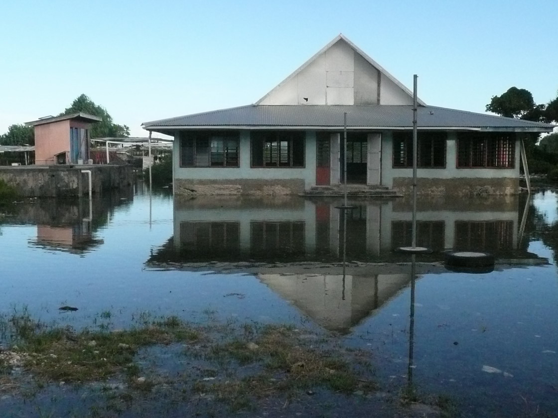 地元の人々によると、年々進む海面上昇に伴い大潮の被害が拡大しているとのこと。今日は首都フナフティの中心部にある集会場前の広場で大潮の撮影を行った。午後4時過ぎ、その広場では若者たちがバレーボールを楽しんでいた。とてものんびりした雰囲気でこれから大潮による洪水が起こるとは想像もつかない。待つこと30分、地面からジワリジワリと海水が湧き出し始める。場所によってはよく公園にある水飲み場の、ひねったら水が「ピュー」と噴き出る、あれと同じように勢いよく海水が地面から噴いていた。音を立てることもなく「あれよあれよ」と一時間もたたないうちにあたりはすっかり海水によって水浸し、大げさに表現すれば洪水現場となっていた。バレーボールで遊んでいた少年たちもいつしか解散、「もう少し遊びたかったなぁ~」と帰った。