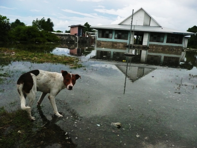 ツバル・大潮による塩害で犬も洪水に怯えている