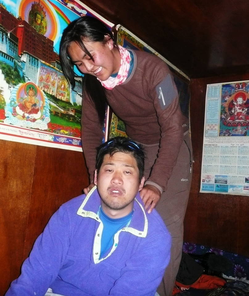 この日はディンボチェ村から5000mを超えるナガゾンピークに高所順応の為に登る。ヒマラヤ初となる藤村氏は高山病で頭痛に苦しめられていたが、それでもナガゾンピークに登って頂いた。登ることによって下山後は楽になる。はずだった・・・・。ディンボチェ村に下山後、様子がおかしくなり、「う~ん」と唸りながら、いつものあの強気な顔(野口健事務所の飯島秘書官と呼ばれている)が嘘のようにしおらしく、また珍しく弱気でもあった。初の高山病にさぞかししんどかったようです。明日はチュクン村(4743m)。