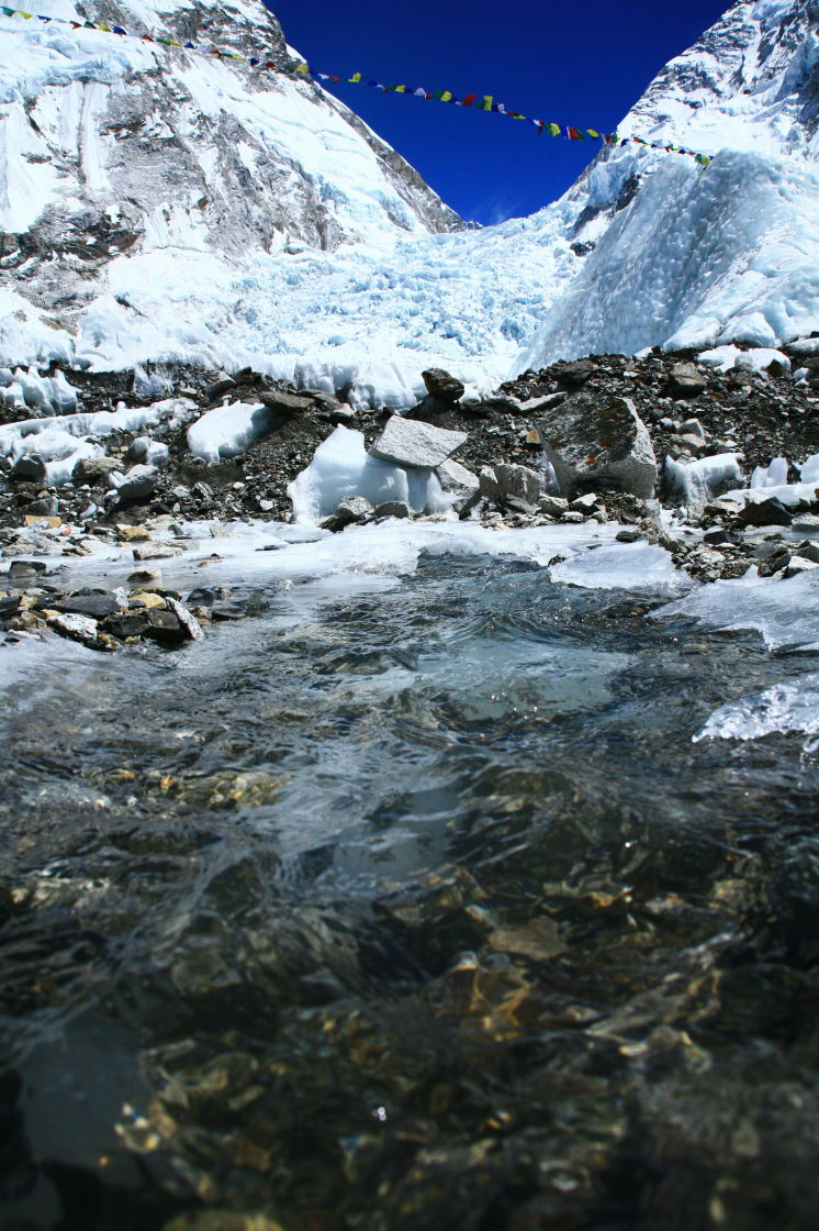 昨年の夏、エベレスト街道沿いはこのクーンブ氷河が急激に溶けだしたことによって洪水が相次いだと指摘されている。この時期に昨年以上に氷河が溶けだしているということは、今年の夏に再び悪夢が訪れるかもしれない。ベースキャンプでごみを回収しながら、ごみ以上に大きな問題があるとひしひしと感じていた。川の流れるせせらぎはまるで春の到来を知らせてくれているような、何も知らなければのどかな音なのかもしれないが、今の私には地球の悲鳴にしか聞こえない。