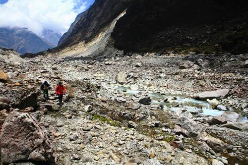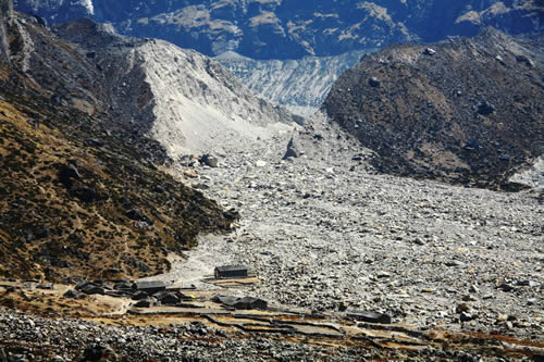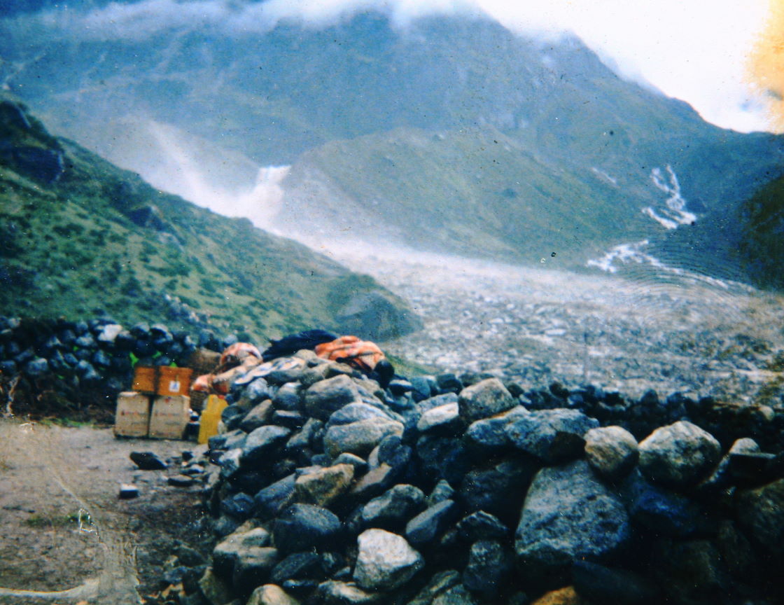 メラピーク登頂の翌日(4月30日)我々はタンナ村まで下った。98年9月3日、午前5時にタンナ村のすぐ上部にあるサバイ氷河湖(地元名タン湖)が決壊しタンナ村の一部が流され、また一面が緑の放牧地がその面影を残すことなくまるで軽井沢の「鬼押し出し」のような死の土地に変わり果てていた。