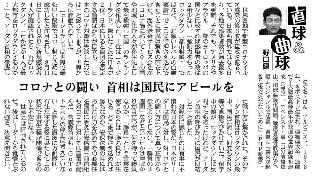 産経新聞連載「直球&曲球」が掲載されました。日本のコロナ政策に関して、思うことを書きました。