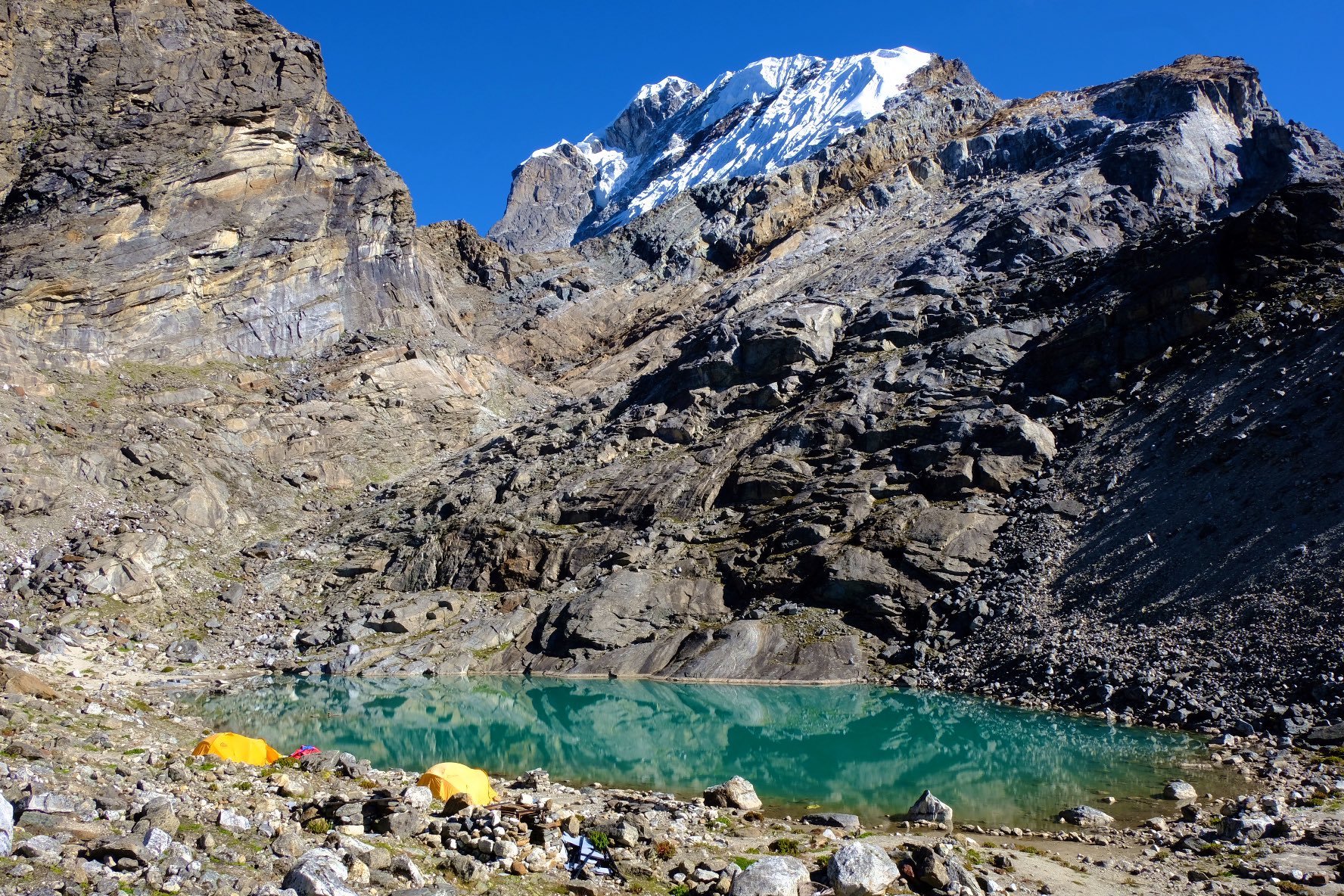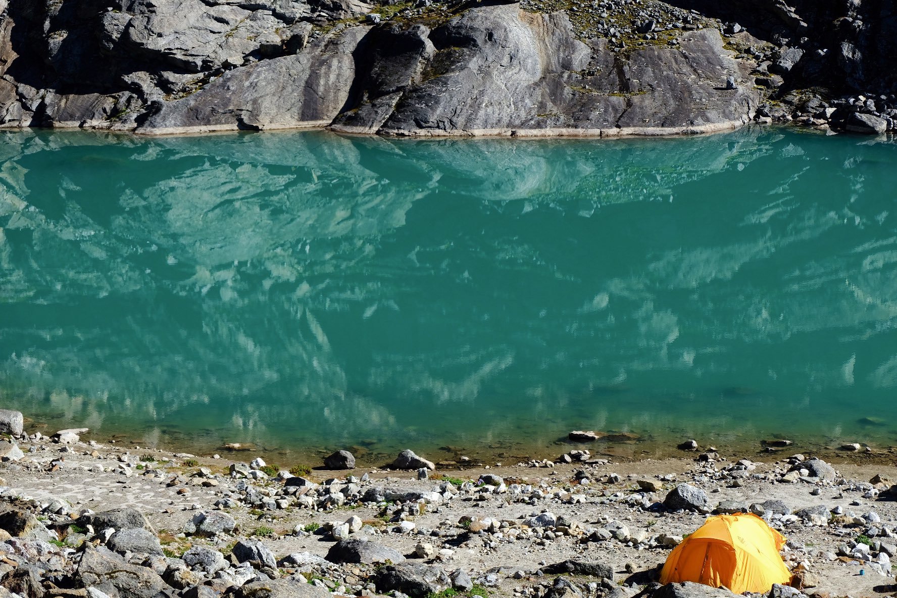 ロブチェピークのハイキャンプ夏は美しい。高所順応のため、トレッキングシューズで登れるところまで行こうと。5500mぐらいを予定していましたが、氷河がかなり溶けていて「おそらく5800m付近までは登ったお思う」とシェルパさん。彼はロブチェピーク専用のガイドをやっていたのでたぶんそう。
