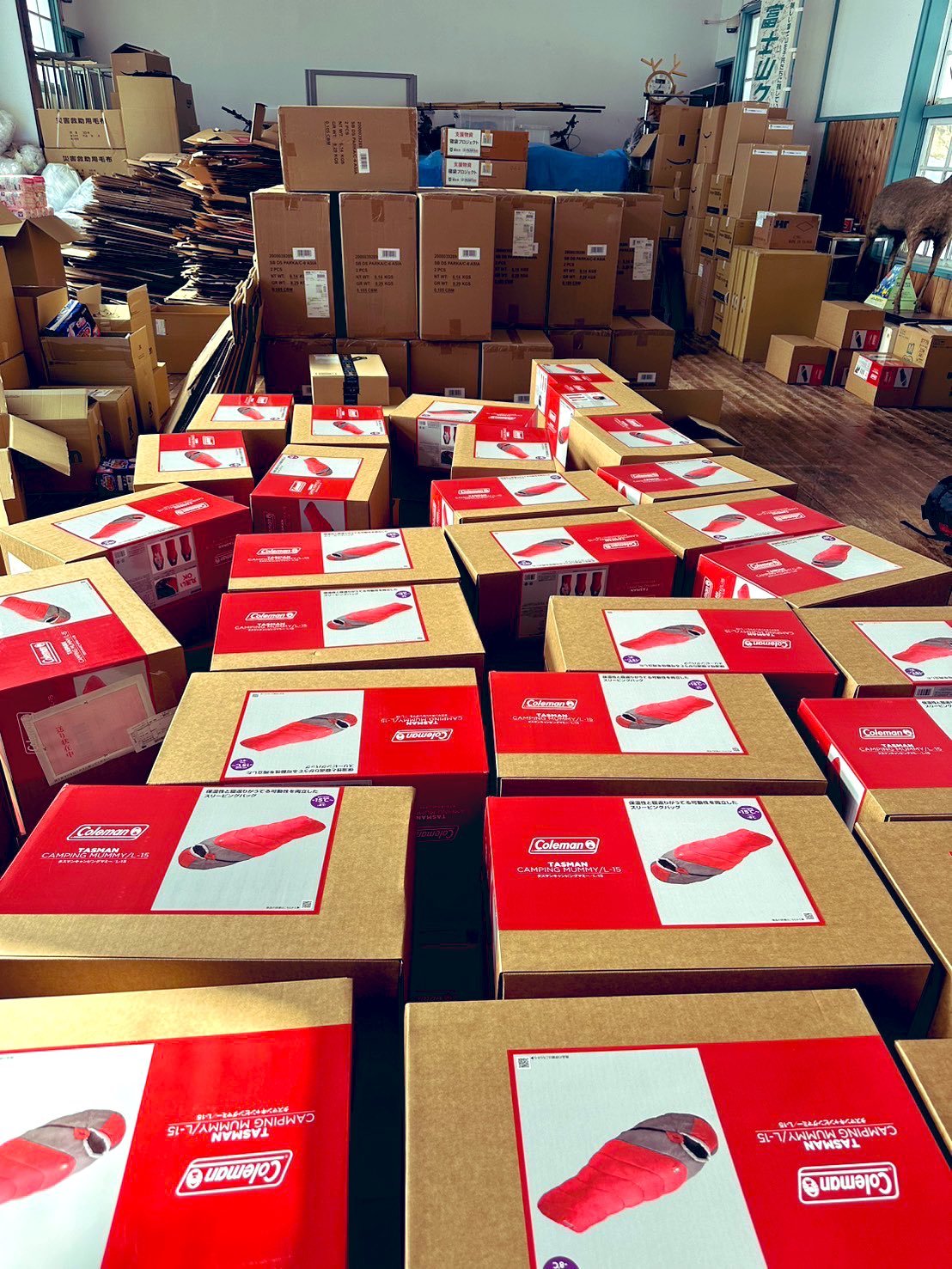本日、事務所にAmazonリストに入っていたコールマンの寝袋が85個、届きました!!!今回の被災地入りで先週まで1070個あった寝袋がついに底をついていたので、嬉しいタイミング!!!