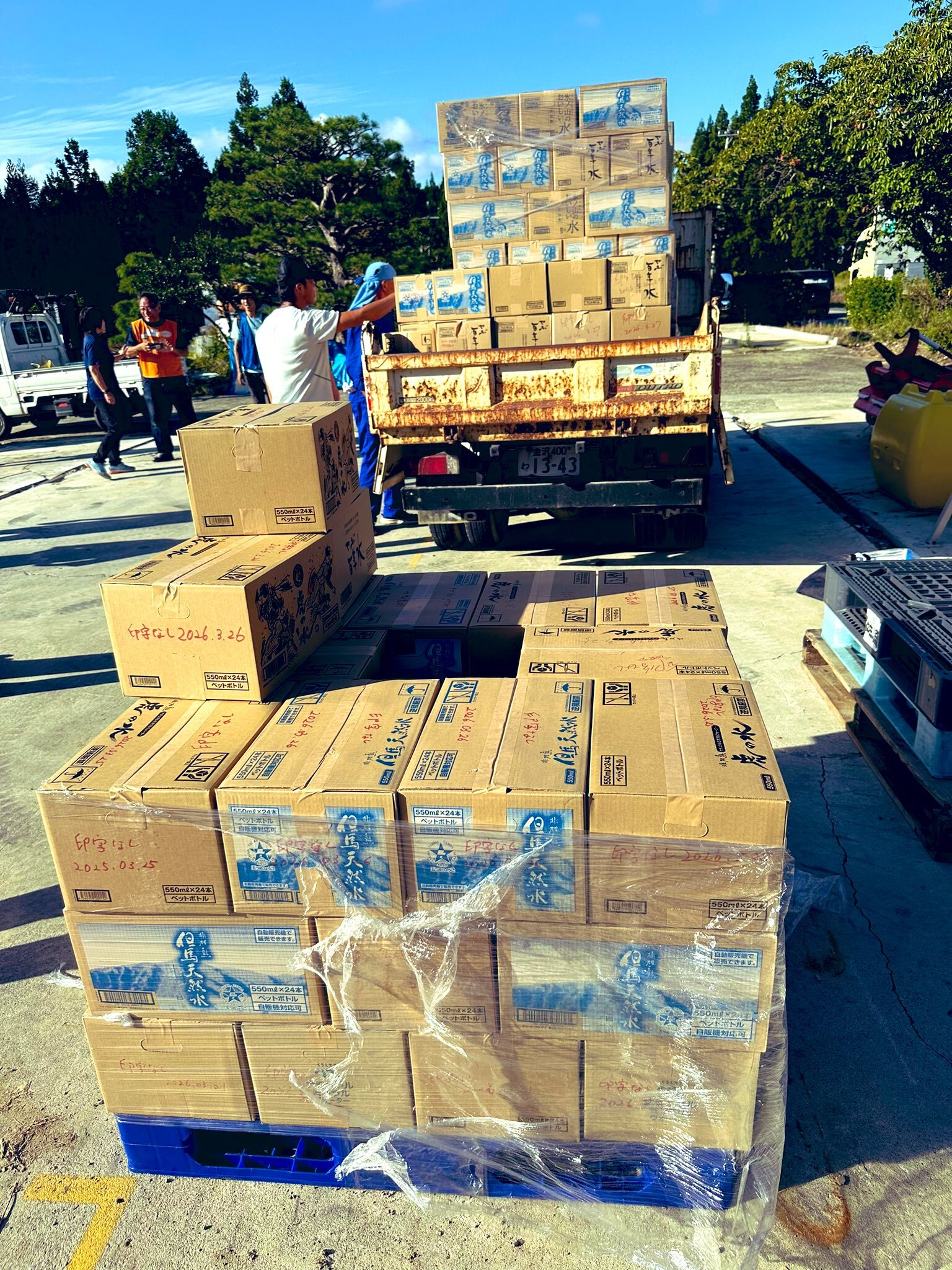 珠洲市の三崎町に冬に寝袋とテントを届けたご自宅がありましたが、そちらの敷地内にミネラルウォーターの一時仮置き場にさせて頂きました。珠洲市内の避難所や公民館から直接、ピークエイドにミネラルウォーターのご希望を頂いた方々にはこちらに直接、受け取りに来て下さりました。また、車がないなどの事情て受け取りにこられない方々のところにはお届けする事に致しました。