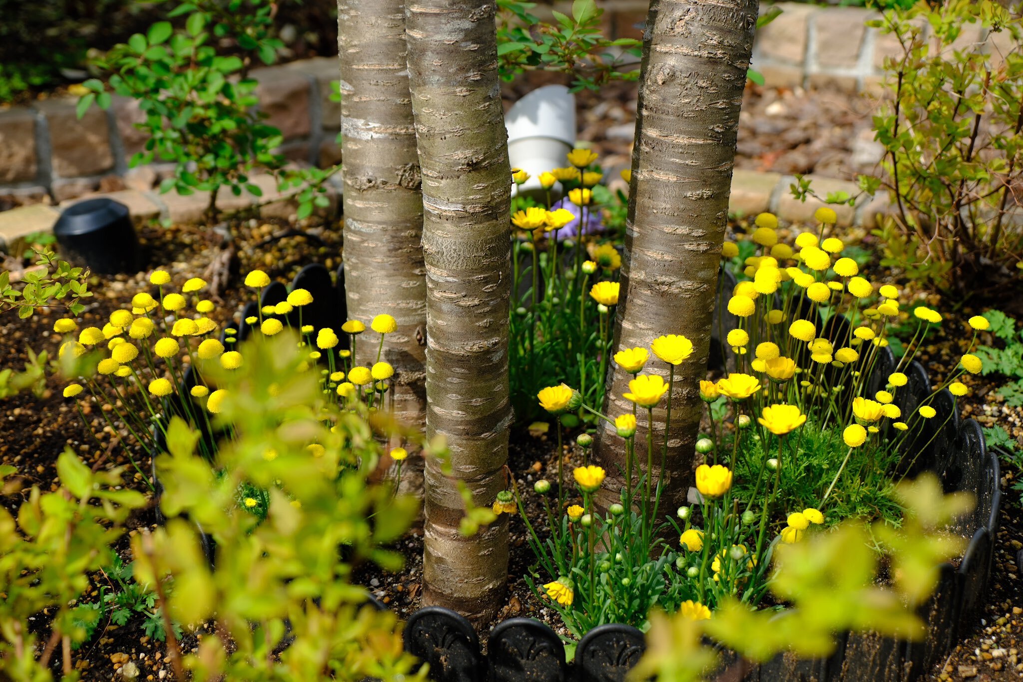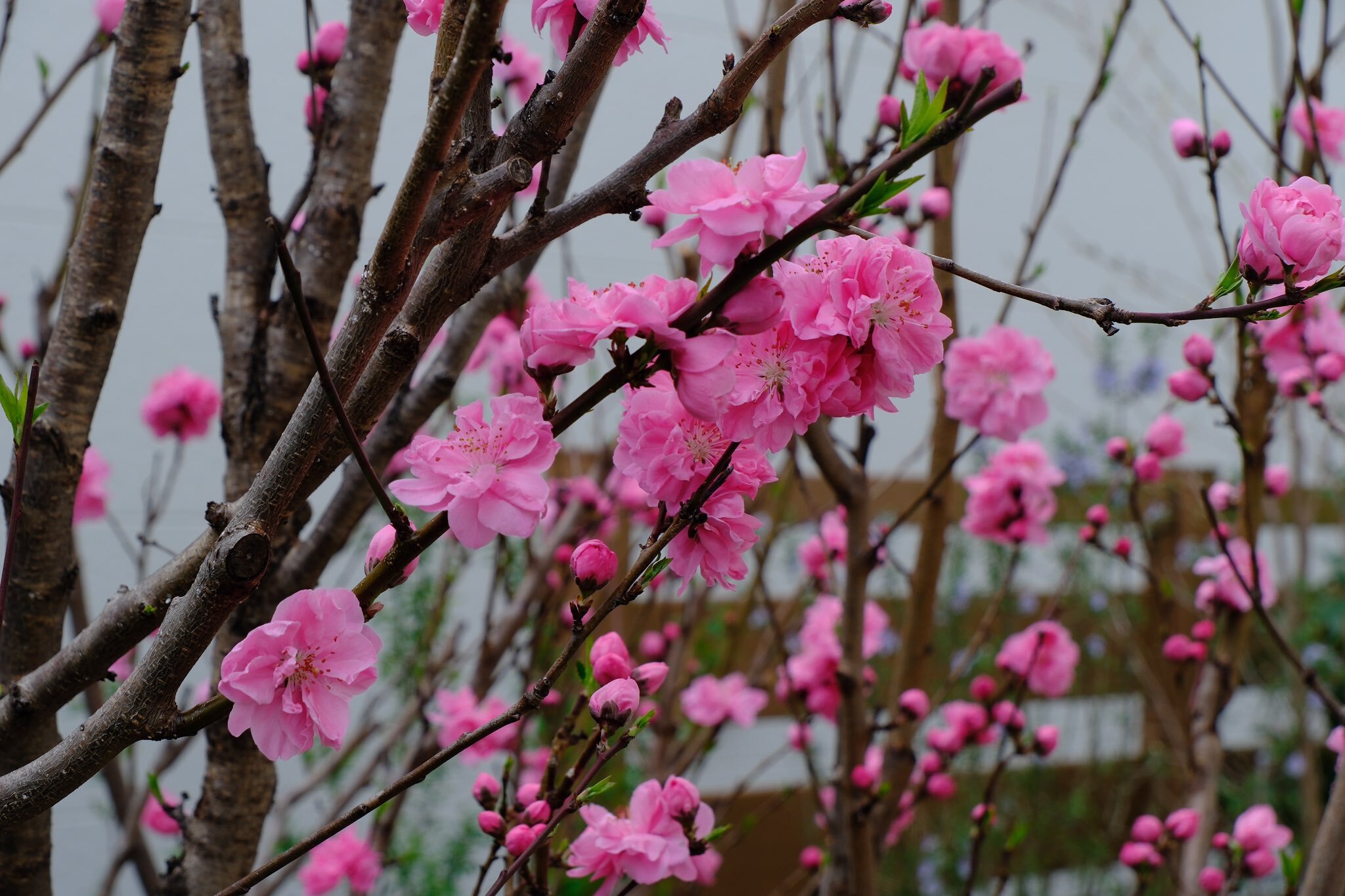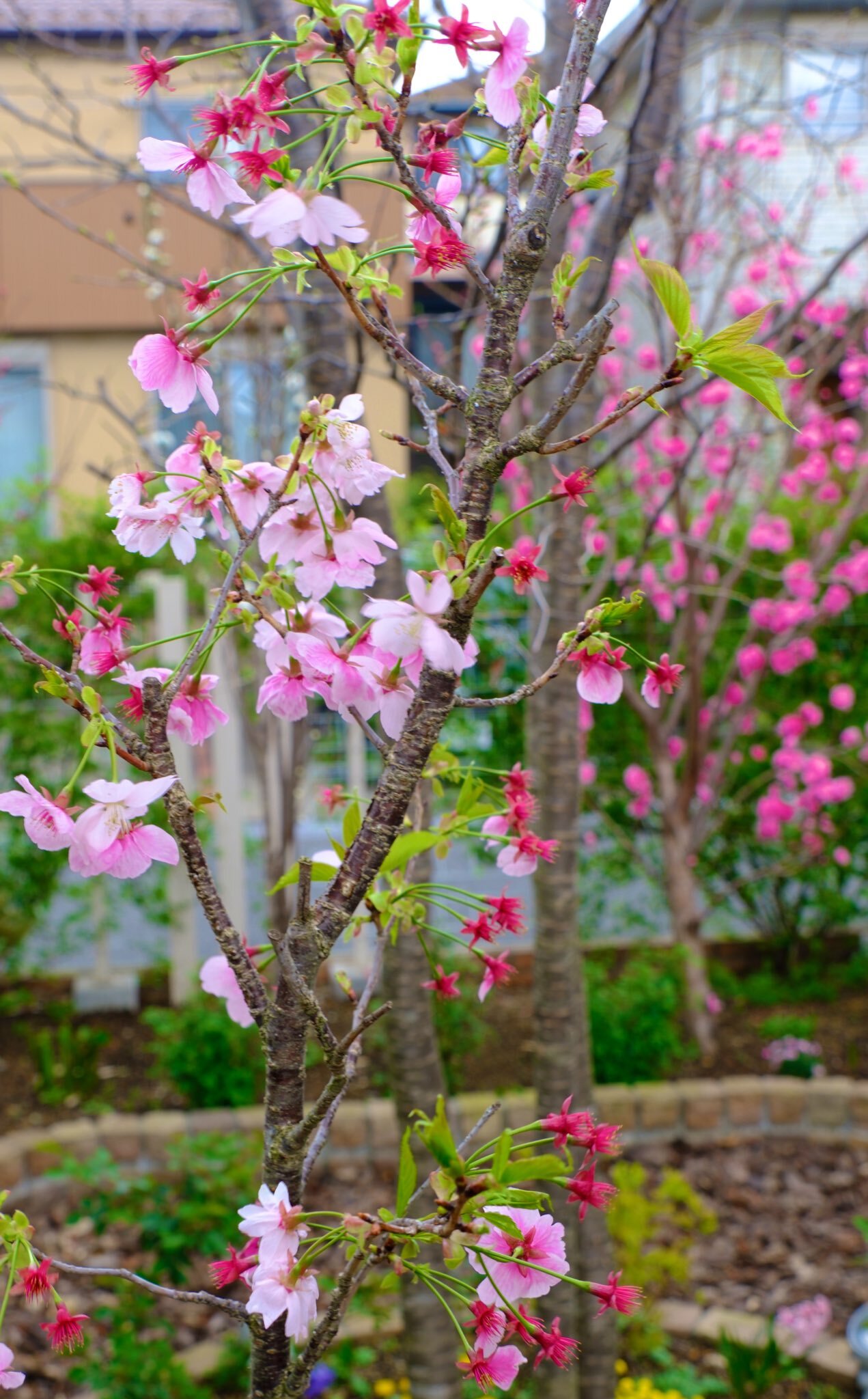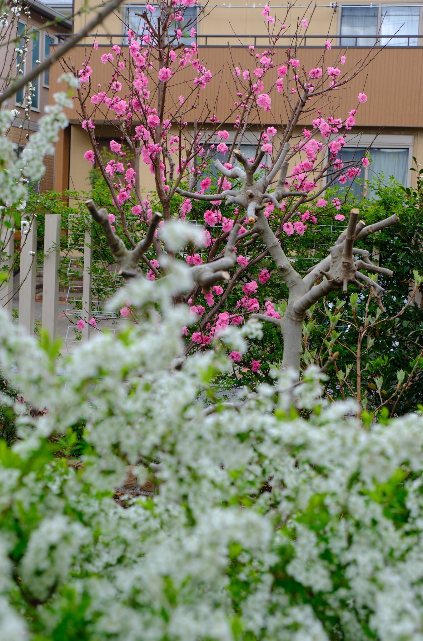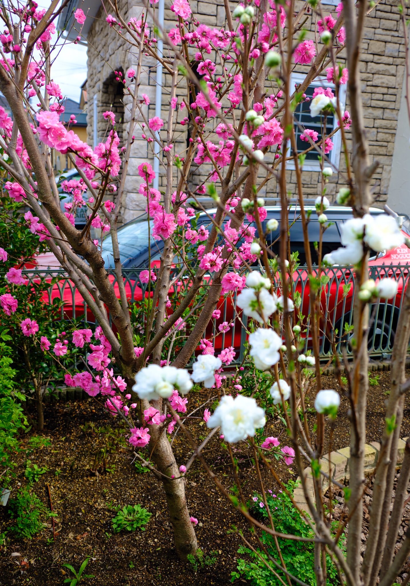 庭に5本の桃の木がありますが、一気に咲き始めました。ミモザの黄色、ユキヤナギの白、桃や桜のピンク。