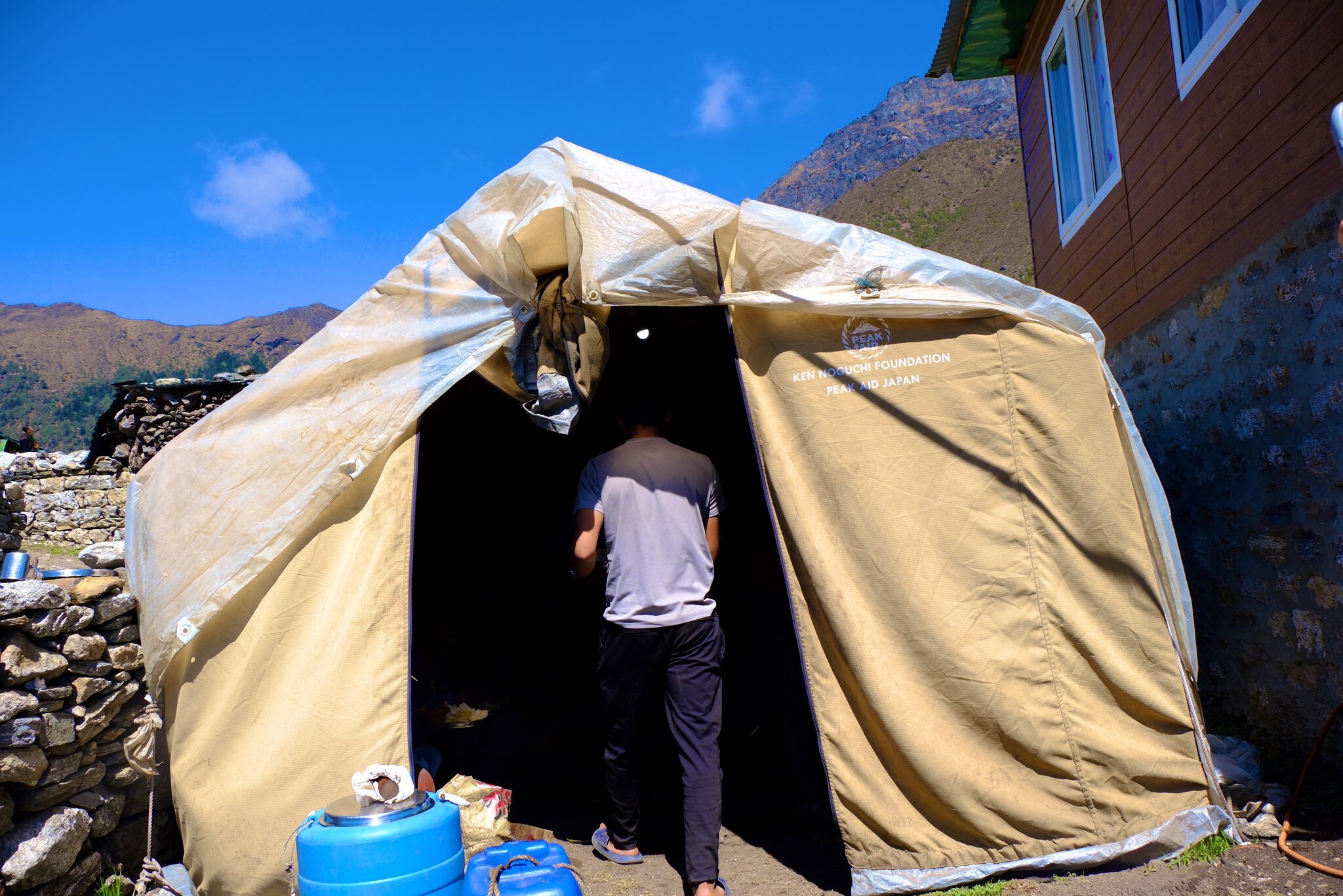 クムジュン村を出る時に見覚えのあるテントが。 10年前のネパール大震災の時に僕はエベレスト街道にいましたが、多くの家屋が倒壊。ヒマラヤ大震災基金を立ち上げ大型テントをエベレスト街道の村々にお届けしました。 あれから10年経ちましたが、今はキッチンテントとして活躍しています。 インドで大量に作って貰いましたが、頑丈なテント!!!