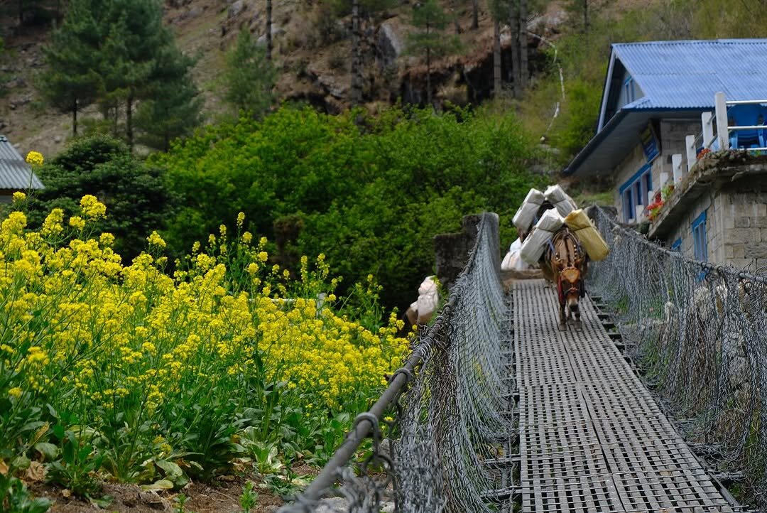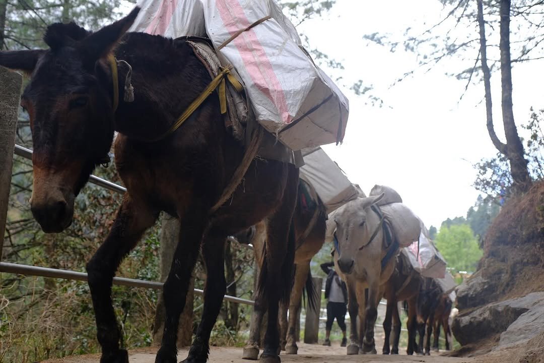 鶏の鳴き声がやたらと聞こえてくる。そしてヤクからロバに。畑とお花畑。そして気温がグンと上がり汗だくに。休憩の度にインナーを着替えたり。