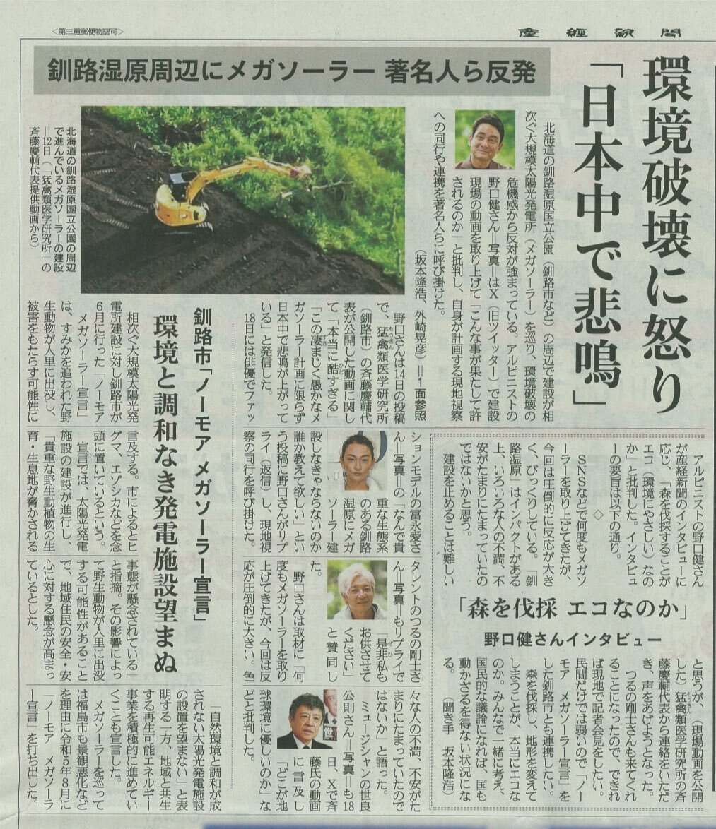 本日の産経新聞です。一面と社会面にて。産経新聞さんは以前からメガソーラー問題には定期的に報道して頂いていました。また、釧路市の現場にも取材にいらして下さるとのこと。国がなかなか動かない中、民間と地方自治体で力を合わせて動くしかない。