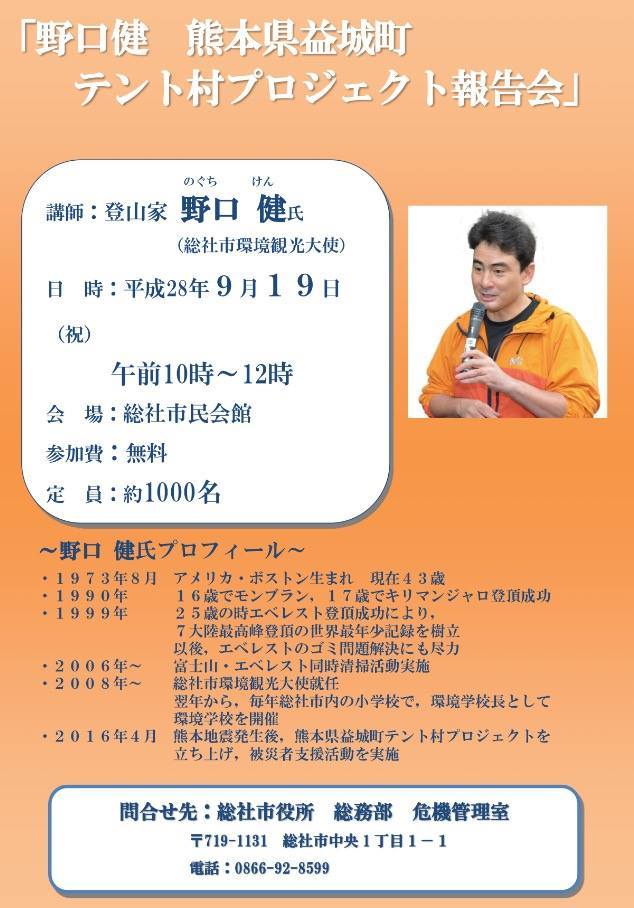 野口健 熊本県益城町 テント村プロジェクト報告会のご案内