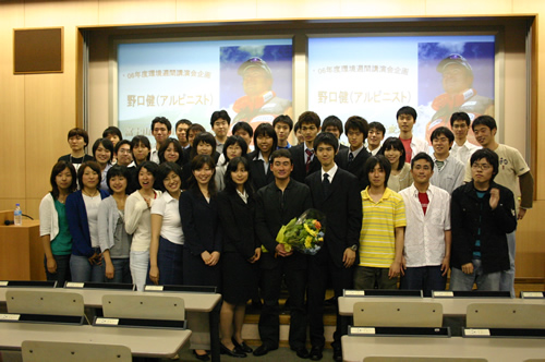 2006年6月15日、野口は慶應義塾大学日吉キャンパスにて講演会を行いました。常日頃から野口は次世代を担う若者に対して大きな期待を 抱いています。「野口健 環境学校」をはじめ、大学生が主催する「環境」をテーマにした講演会などにも積極的に赴いています。講演ではエベレスト清掃登山 のエピソードを中心に環境保全の大切さ、そして挑戦することの意義を切々と説きました。講演終了後、学生から質問が飛び交い、「何かを成し遂げること」に ついて「とにかく最初に僕は宣言してしまって、それを実現しようとやってきた。最初に言ってしまうと、その言葉に対する責任が生まれる」と独自の成功哲学 を語る姿が印象的でした。