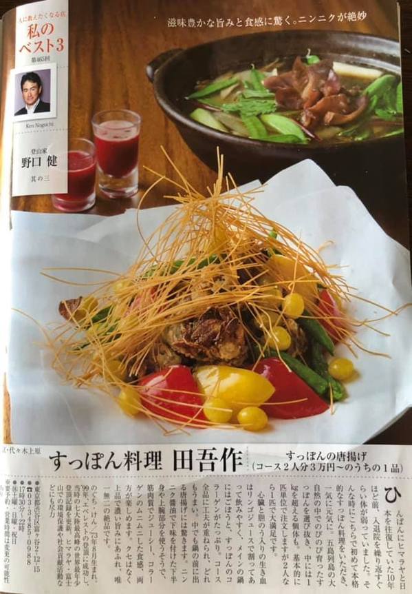 今週発売の週刊現代に掲載の「私のベスト3」。最後にご紹介するのは、すっぽん料理 田吾作さんです。 スタミナたっぷりのすっぽん料理、疲れた体も一気に元気になります。 すっぽん料理 田吾作 03-3485-0988 要予約となっています。