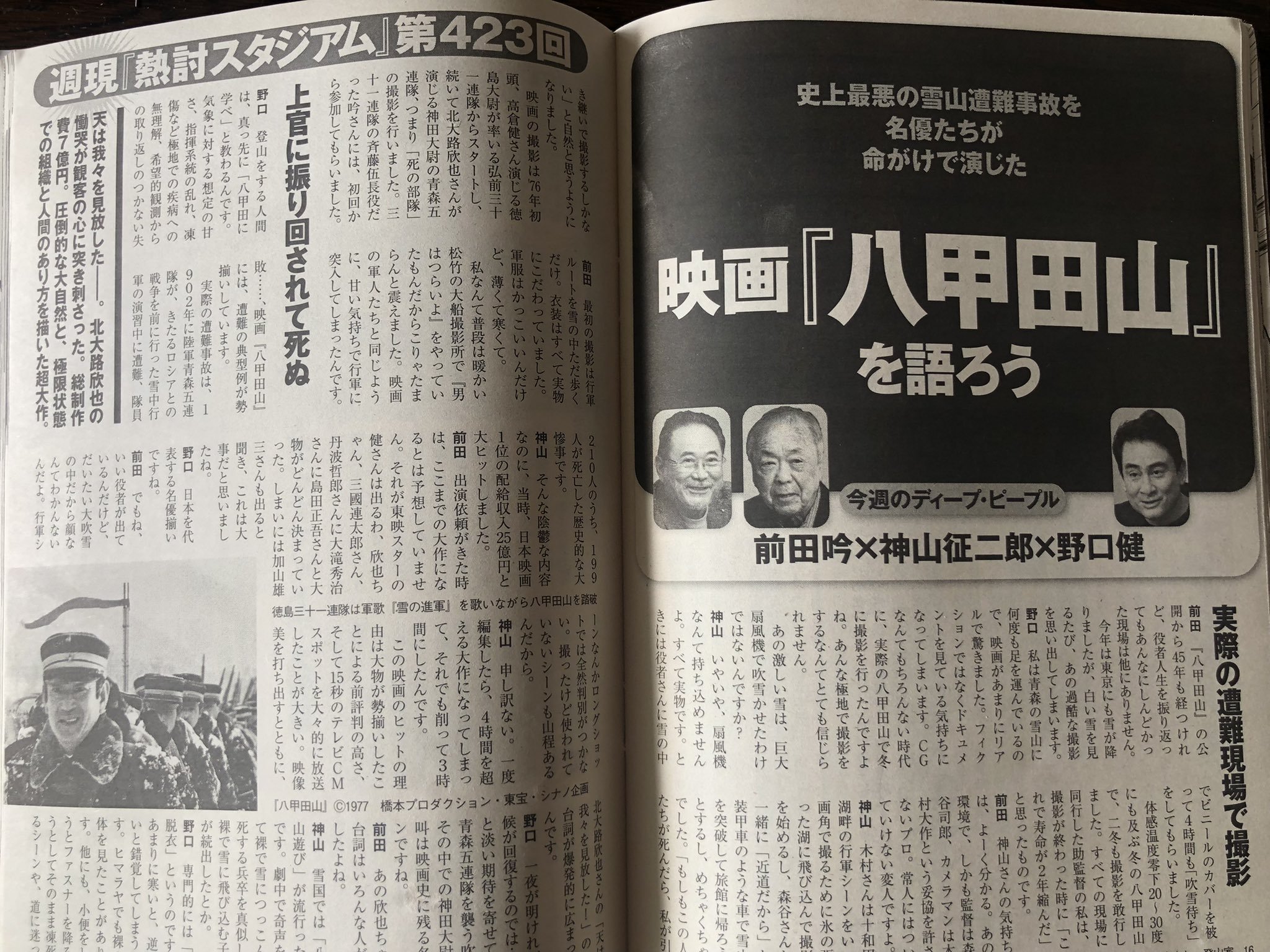 野口の大好きな映画「八甲田山」。本日発売の「週刊現代」にて、俳優の前田吟さん、映画監督の神山征二郎さんと鼎談をさせてもらいました。 45年前の映画ですが、登山家として、この映画化から学ぶことは、沢山あります。ぜひ、ご覧ください。 野口健事務所