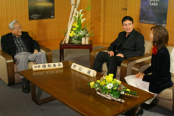 2005年12月23日、東京・都道府県会館にて滋賀県知事・國松善次氏との対談が行われました。この対談はびわ湖放送で2月に放送される 番組収録として行われました。滋賀県の環境への取り組み「マザーレイク21計画」「琵琶湖森林づくり条例」と野口の中心的な活動である「富士山」での取り 組みでは、多くの共通点が見出され、対談は都レンジャー創設の話滋賀県が来年度の4月から森林育成の為に導入する目的税「琵琶湖森林づくり県民税」にまで 及びました。野口は「今まで1000円だった県民税に森林目的税+800円でほぼ倍の税を県民は負担するようになる。おそらく、その過程には多くの抵抗が あっただろうし知事には苦い思い出もあったであろうと思う。それでも琵琶湖の保全を掲げて当選された國松知事がぶれることなく環境政策を押しし進めるのは すごい。富士山は琵琶湖のように滋賀県だけで管理できる状態ではないので、一概には同じとは言えないが、入山料の導入、森林目的税の導入など大変参考にな ることが今日は聞けてよかった」と語っていました。放送は平成18年2月10日に予定されています。