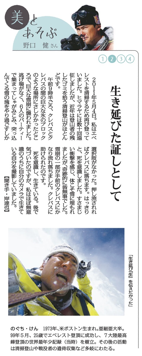 毎日新聞夕刊「美とあそぶ」のコーナーで、野口が撮影した写真を4週に渡って紹介していただいています。 第2回目は、雪崩から生還直後に無意識に撮影していた写真をご紹介いただきました。