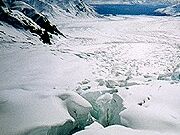 | 高所では「クレパス」という地表の裂け目があちこちに口を開けて(時には雪に覆われて)待ちかまえている。 |