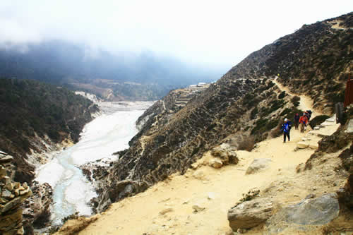 パンボチェ村に向かって歩いている道中にネパール人3名がごみを拾っている。極めて珍しい光景に質問してみたらSPCC(Sagarmatha Pollution Control Committeeエベレスト国立公園の汚染を監視している機関)のメンバーがナムチェバザール村からエベレスト・ベースキャンプまで清掃しながら登るとのこと。