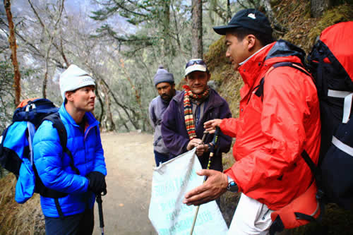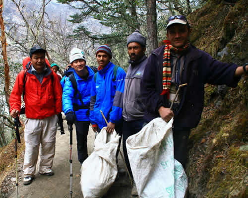 SPCCに13年間務めるリーダのダンバードル・バニヤさん(32歳)は「年に3回、こうしてエベレスト街道を清掃しながら登っているとのことだが、ベースキャンプまで荷を担ぐポーター達はルクラ村よりも低い所から季節労働者としてエベレスト街道に上がってきているので、地元意識が無いのでごみを捨てて汚れてもまったく気にしない。我々の前じゃごみは捨てないけれど、見えないところでは捨てている。また観光シーズンはトレッカーもペットボトルを捨てている。もう1つの問題はロッジ(山小屋)が急激に増えた事によってごみが増えたね。以前は地元の村人がオーナーだったけれど、最近は町の人がエベレスト街道にロッジを建てている。彼らも自分たちの村じゃないから平気でごみを捨てる。人が増えすぎたのが問題です」と話す。