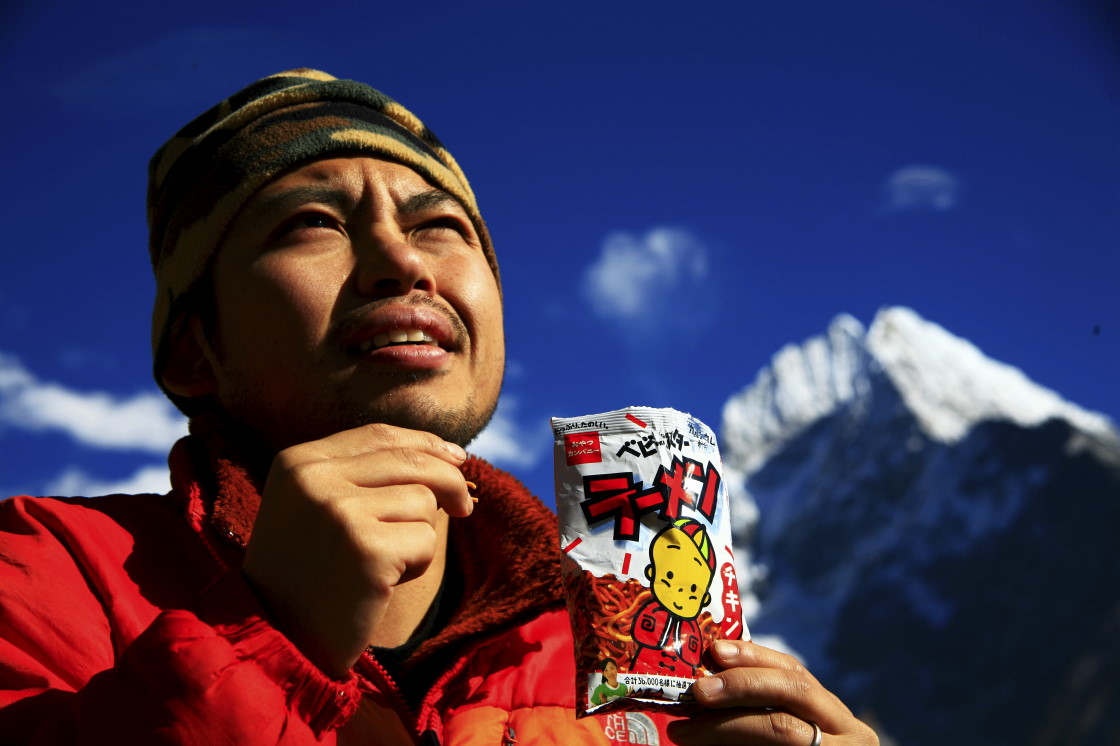 そして今日の記事のタイトルであります「ベビースターラーメン」ですが、平賀カメラマンは「ベビースターラーメン」命でいつ何時においてもベビースターラーメンを持ち歩いている。カメラよりもベビースターラーメンを手に持っている時間のほうが長かったりして。どれだけ好きかと言うと、わざわざエベレストの山頂にまでもってきて、山頂でポケットから取り出しているので、「こんな所で食べるつもりか!」と驚いてみていたら、なんと自分で自分にカメラを向けてベビースターラーメンと一緒に記念写真を撮っているではないか。一緒に登った相方の僕よりも先にベビースターラーメンと記念写真を撮る彼の精神構造を分かりかねたが、ただ1つだけ分かったのは彼がベビースターラーメンを心から愛しているということである。確かに平賀カメラマンからよく分けて貰って頂くが、あの昔から一切変わらない味は飽きなくていいですね。いつの間にか僕までベビースターラーメンが好きになり気がつけば自身で買うようになっていました。