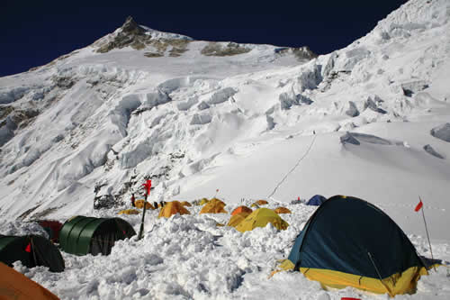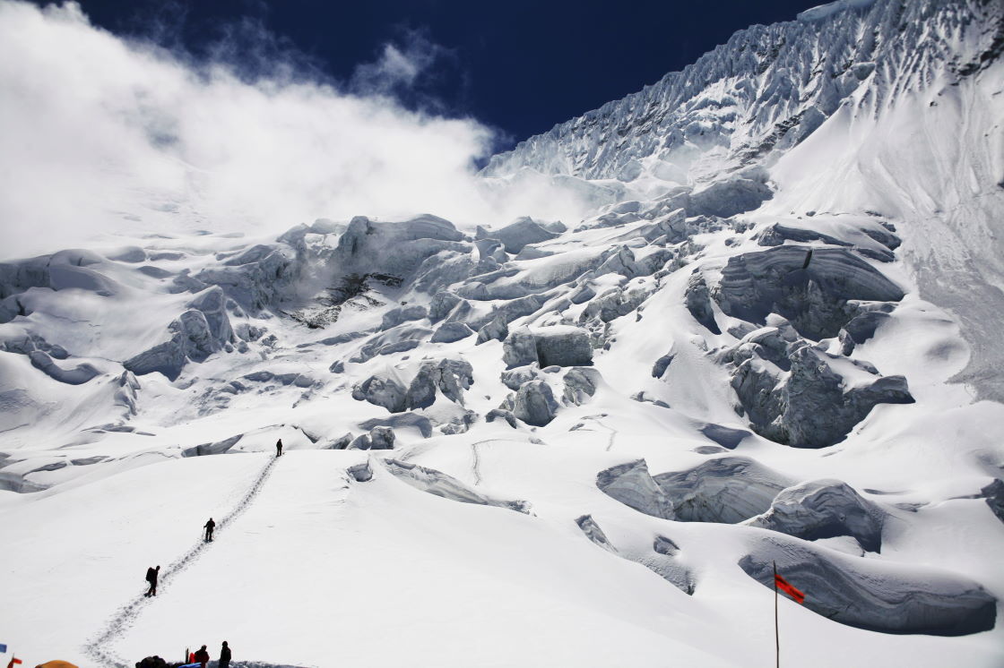 サマ村の僧侶による安全祈願の翌日から晴天。キャンプ1手前まで登り鈍っていた体を少し動かせ幾分か気分的にも楽になった。そして4月19日、いよいよキャンプ1(5700M)へ向けてベースキャンプを出発。進行方向右側の斜面にデブリ(雪崩の跡)がいくつもあり、そのデブリの上を通過しなければならず、いまにも落っこちてきそうなべったりした雪の斜面をチラ見しながら進むしかない。キャンプ1手前の斜面では前日にロシア隊4名が雪崩に流されたデブリがきれいに残っていた。デブリの横に複数の人が走ってレスキューに向かってであろう足跡がいくつも残されてあり、その時の緊迫した空気が再現されているかのようであった。