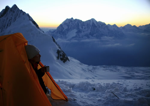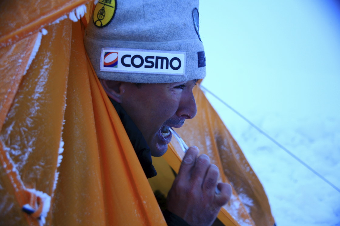 ベースキャンプを出発して約5時間、無事にキャンプ1入り。しかし、天候が再び崩れ雪。テントの中でじっと過ごすのだが、なんせ寒い。歯を磨くのだが、口に入ってくる凍てついた大気で歯がキーンと沁みる。寝袋の中でマン丸になりながら眠りについたら今度は頭痛で目が覚める。高山病さんがいらっしゃったのだ。ベースキャンプですら4日間連続して頭痛。