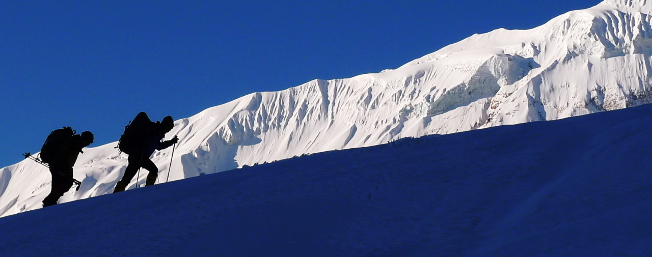 前へ前へ キャンプ1から雪崩多発地帯を横に横切らなければならない個所があり、ここばかりは気をつけようもなく、来るときにはちゃんと来る雪崩コースであり、我々が通貨している最中にやってくれば二人ともあっという間に飲み込まれ終りとなる。「おい、平賀、ここは上を見ないで何も考えずに急いで通過しよう」と声をかけたら彼もそれなりに緊張している様子だったので、もう一度振り返り「おい、平賀!もしもの事があったら次は靖国で会おう」と伝えたが、しかし奴はキョトンとした表情のまま「???」と無反応。私と彼とでは世代が違ったのかもしれない。いずれにせよキャンプ1〜キャンプ2間はいつでもどこでも雪崩が起きうる。そしていずれも気をつけようがない。確実に雪崩に遭遇しない手段があるとするのならばマナスルに近づかないこと、それしかない。マナスルと203高地がだぶってしまうのは気のせいか。