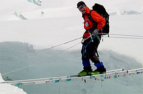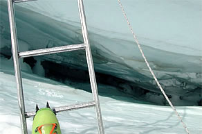 金属のハシゴと登山靴の底につけているアイゼンが同じ金属のため相当神経を使わないと滑ってしまう。1本のハシゴで届かない場合は、3〜4本のハシゴをロープで連結して使用する。連結されたハシゴの数が多ければ多いほど、歩いている最中にハシゴがフワフワと揺れる。眼下には100メートル以上も深い真っ暗な世界が、まるで口を大きく広げて「おいで おいで」と待っているかのようだ。シェルパ達はハシゴを渡るときによく
