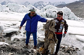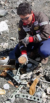 午後になり、韓国隊員の金さんがベースキャンプ付近の氷河から古びた金属の魔法瓶と火器を持ってきた。その魔法瓶の裏に薄っすらと年号が書かれてあり、よくよく確かめると1952年の物であることが分かった。慌てて我々も金さんが見つけ出したポイントまで駆けつけた。我々のテント場からたかだか3分。当時は木材のドラムを使用していたのか、木材の破片が散乱している。缶詰、テントの残骸、火器や靴などが至る所に散らばっている。その中に、妙な形をした、どこかで見覚えのあるようなゴム製の物が発見された。