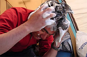 二日目の休養日。朝8時までグッスリ。夜中から風が強くなりテントがバタバタ騒いでいたが、眠さのあまりいつの間にか眠っていた。熟睡しすぎたのか、朝起きたら顔がむくみ、頭がフラついた。朝からの登山に備え、頭と体を洗った。桶に貴重なお湯を入れてもらいテントの入り口で少しづつ髪の毛を濡らすのは相変わらずだが・・・。