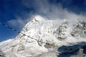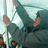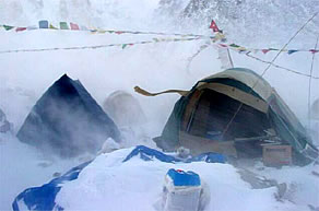 と思いきや、いきなり、テントの真横からボン風に吹っ飛ばされ、組み立て式のベッドから落ちてしまった。それから、休む暇もなく強風がベースキャンプを襲い、必死の思いでテントから出てみれば、風に巻き上げられた雪が視界を悪くし、風の勢いで立ってもいられない状況! ふと自分のテントを振り返れば、今にも飛んでいきそうなほどに傾き、慌ててテントを支えようとつかんだものの、僕の力では飛んでしまいそうな勢い!! それを見たシェルパが飛んできてくれたが、このままではポールが折れると、まずテントのポールを抜き、テントを潰してから、その上から何個も石を起き、飛ばされないようにした。寒さのあまり手はかじかみ、暖かいテントに逃げ込みたいが、しかし、飛ばされそうなテントはほかにもある。それから、約3時間、強風からテントを守るべくシェルパを総動員し、駆けずり回った。機材テントの入り口は見事に破壊され、パソコンや衛星電話に雪が被ってしまい、急いで機材を他のテントに移し乾かした。