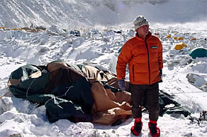 「こっちは強風でテント壊された。ここはひどいよ〜ここ何日間もテントの中でうずくまっている。今年のエベレストはひどい。寝むれもしない。クワ〜大変だ」