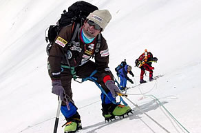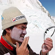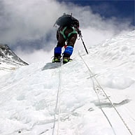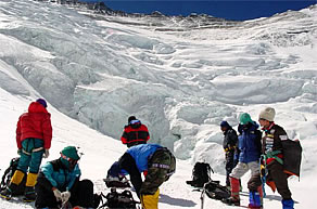 高畑隊員は登山経験がまだ浅いので、キャンプ3へつながる氷壁の取りつきまで、同行しキャンプ2へと戻っていった。本人はキャンプ3まで行きたいと希望していたが、自分の能力以上の領域に突入するべきじゃないと、言い聞かせ、高畑隊員も納得してくれたようだ。村口隊員やシェルパ達の指摘の通り、キャンプ2の上部にあるローツェフェースと呼ばれる高さ1000メートル以上のこの氷壁は98年や99年の時とは姿を変え、ガリンガリンに凍りつき、アイゼンの刃がなかなか氷壁に食い込んでくれない。