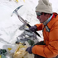 ピッケルで氷を砕きながら、少しずつテントを引っ張りだすのだが、1張り回収するのに、1時間ほどかかった。さらに急斜面であるから、我々がそのまま滑落してしまわないように、ゴミが散乱する場所にフィックス・ロープを打ち込み、そこに体を確保しながらのゴミ撤収作業だった。