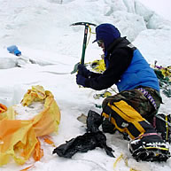 そして強風が始まり、寒さの為に指先の感覚が無くなった。先に着いていたシェルパ達がもくもくとテントの回収を行っているが、氷の下に埋まっているテントを取り出すのは至難の業だ。