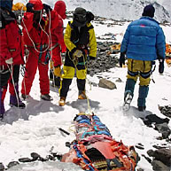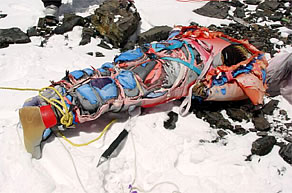 との返事。クライミング・シェルパにとって山での死は他人事ではない。遺体に石を投げるのも、彼らなりの死に対する必死の抵抗のように感じられた。遺体に無数のロープが結び付けられ、4〜5人で遺体を引っ張る。ガレ場だけに、石や岩に遺体がぶつかり、なかなか引っ張れない。また、酸欠も手伝い、遺体を引っ張っている僕自身が遺体になりそうなほど、息が上がってしまった。