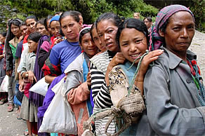 バスに遠征隊の荷を詰め込み悪路に揺られながら5時間、国境に到着。ここからチベット側から迎えに来ているトラックに荷を積み替えるのだが、村人がその荷を背負うと、バスの前に行列が出来てしまった。ポータとして荷を運べば収入になるということで、それはそれは荷物の取り合い合戦が展開。我々はその迫力に圧倒されっぱなしで、ただただ見ているよりなかった。無事にチベットとの国境越えを果たしたものの、迎えに来ているはずのトラックがいない。待つこと、2時間やっとトラックが迎えに来たが、雨が降っていたので荷台にシートを被せ我々登山隊員とシェルパもそのシートの下に潜り込んだが、排気ガスが入ってきて、呼吸困難どころかガス中毒になりそうになり、めまい、吐き気に襲われた。40分ほどで宿泊地のザンムーに到着したがみなフラフラ。ザンムーは大雨地帯でいつ来ても湿気ジトジト。ホテルの壁もカビだらけ。シーツも枕もカビの匂いで鼻がツーンとしみる。陰気な町なんだな〜