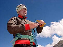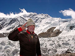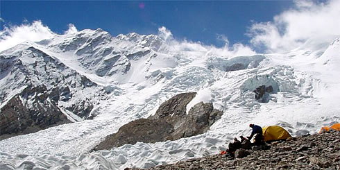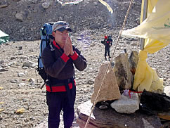 気合充分、祭壇にいつもより長く手を合わせる野口隊長。ABCからは氷河を右に見ながら長いモレーン(氷河の圧力によってできたガレの山)を3時間ほど進み、デポジットキャンプへ。ここはキャンプ1とABCの中間点に位置し、氷河の入り口にあるため、重い登山用具などを置いておくための場所。ここから上は本格的な冬山登山になるため、私はここで隊長を見送り、ABCへ。