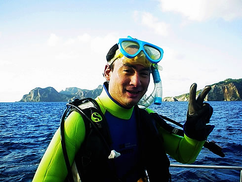 小笠原諸島に上陸して直ぐにダイビングに出かけた。ここでも素敵な出会いがあった。「KAIZEN」のオーナーでもある山田氏だ。真っ黒に日焼けし、サングラスの似合う石原裕次郎にどことなしか雰囲気が似ている海の男だ。山男と海の男は意外にも気が合うもので、山田氏ともすぐに打ち解けられた。25時間も船に揺れ、一息入れたかったが中3日間しか滞在できない。一時間たりとも時間を無駄にはできない。用意されたお弁当だけ食べてすぐにダイビングに直行。真っ青なコバルトブルーかと思いきやエメラルドグリーンの海。海草が少ないのも手伝い海の中が砂漠のように真っ白。28メートルほど潜ってみたが大人の太ももよりも太いカイコイセエビ。世界中の海に潜ってきたけれどあんなに大きな伊勢海老を見たことがない。そのすぐ横に小さく仲良く寄り添うハタタテハゼ。二匹の健気な純愛にこちらまで、ほのぼのしてしまった。
