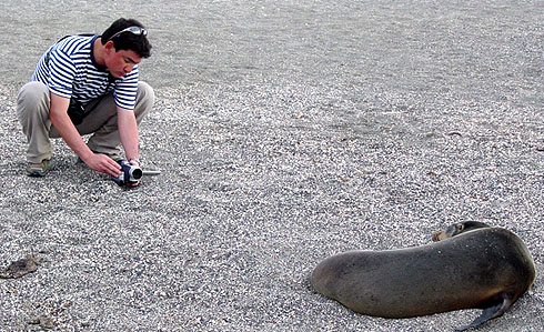 ガラパゴスで驚いたのは野生動物たちが人間を怖がらないどころか、アシカなどは「遊ぼう!」とばかりに近寄ってくる。海で泳いでいると、一緒に泳ぎたがったりする。イグアナもペリカンも同じで我々が近づいても無視しているかのようにまったく我々のことを気にしない。砂浜では人とアシカが並んで横になりながら日向ぼっこをしている姿はなんとも微笑ましい。だからといって人から動物達に近づいていくとナチュラリスト・ガイドに注意される。あくまでも彼らから近づいてくるも!ということらしい。特にアシカやオットセイの子供には近づかないようにと厳しく注意された。人は安全だと教えなきゃいけないとのこと。近づいて見たい、それでもグッと我慢して動物達との距離を保つ。人の姿を見ても逃げようともしないのは、永年にわたりこの「人と動物達」とのルールをガラパゴスに訪れる人々が守ってきたからだろう。僕なんかはついつい近づきすぎて何度か注意されてしまったけれど・・・。