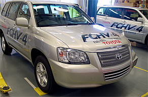 と宣言した。燃料電池車の市販に関しては、トヨタとホンダが2003年中に市販を予定していたが、トヨタはこの計画を一年前倒しで実行するとのこと。服部さんは世界に先駆けて市販化する燃料電池車「FCHV−4」を見せてくれた。クルーガーVのボディーを使ったその燃料電池車は純水素を直接車内に積むタイプ。試乗してみたがハイブリット車よりも低速でのトルクの力強さを感じた。エンジン音というよりも、モーターで動いているだけに、子供の頃に聞いた懐かしいラジコンカーを思い出す音が車内に伝わってきた。ラジコンに乗っている感覚。未来の車に興奮しながら、何度も研究所内をグルグルと走りまわった。